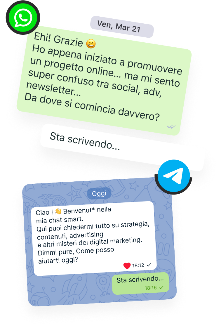 Una volta pronto, condividi Ai There! con la tua community tramite un numero WhatsApp o una chat Telegram. La tua chat intelligente gestirà attivamente le conversazioni, giorno e notte, sui canali che preferisci.